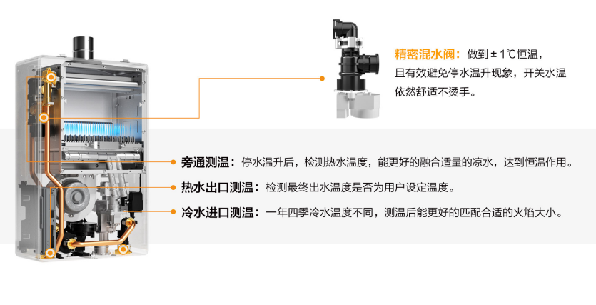 恒温燃气热水器采用比例阀式的控温原理。管路中串有一个流量传感器,燃气气门为一电动调节阀(即比例阀)。流量传感器将水流量转换为相应的电信号并输入控制器。控制器根据输入信号的强度或频率来调整气阀开度,使燃气流量与水流量成正比变化,从而达到恒定水温的目的。比如庆东纳碧安的NGW580C系列零冷水热水器,是首款采用三点测温的燃气热水器,能够通过测量旁通测温、冷水进口测温、热水出口测温,配合以精密的混水阀,让温度控制在±1℃,人体基本感知不到温度的变化。在使用过程中,水温基本不会变化或者变化幅度很小。