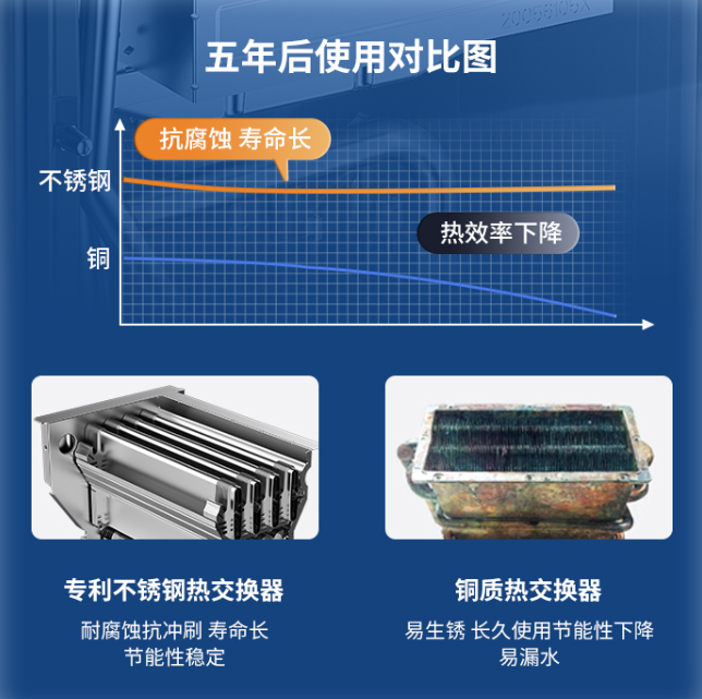 最后,选择一款好的热效率既高又稳定的燃气壁挂炉,将会更好的节省燃气费用,譬如庆东纳碧安的NCB700系列燃气壁挂炉,其热效率可高达107.9%,并且内置的不锈钢冷凝专利热交换器(发明专利号:ZL200680045315.1)配合其专利的“同向顺流冷凝技术,进一步提升机器的使用寿命以及热交换器效率”不但节省燃气,而且随着使用时长的增加,同样也能够稳定的保持很高的热效率。