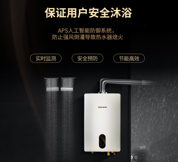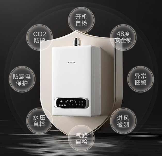 对于一款安全实用的燃气热水器而言,其往往搭配有多维的安防系统,实时监控并且能够做到提前预警,比如庆东纳碧安的NGW580C系列的燃气热水器,其搭载有CO防护、防漏电保护、水压自检、气路自检、进风检测、异常报警、48度安全锁、开机自检等多重安全防护。