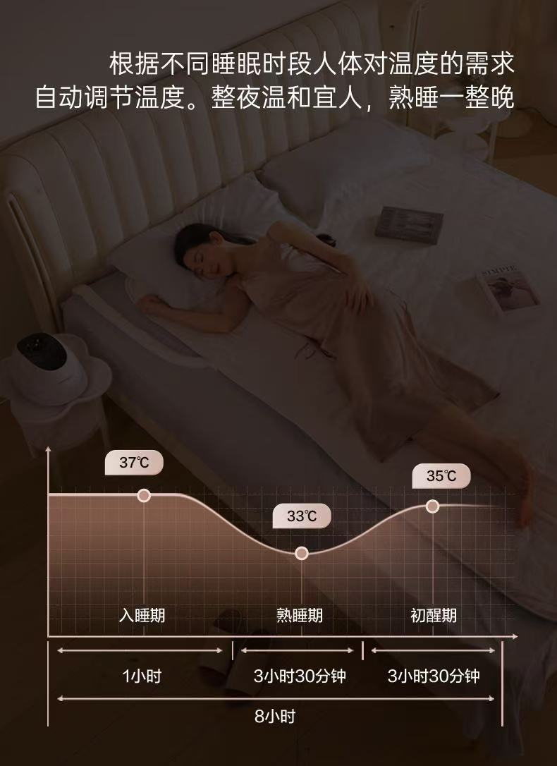 除了无辐射这一核心安全亮点,EMC350系列在舒适度与安全性上的设计也十分全面。在健康守护上,它搭载了专利智能负离子空气净化功能(实用新型专利:ZL202121945919.X),能释放负离子净化枕边空气;同时具备深层除螨功能,经广东省微生物分析检测中心检测,螨虫灭杀率高达99.9%,潮湿季节也能保持床垫干爽。在温度控制上,其采用高精度出回水双温感监测,实现±1℃超微温差控制,避免传统水暖床垫忽冷忽热的问题,还能根据入睡期、熟睡期、初醒期的人体需求自动调节温度,从37℃逐步过渡到33℃,贴合8小时睡眠周期。
