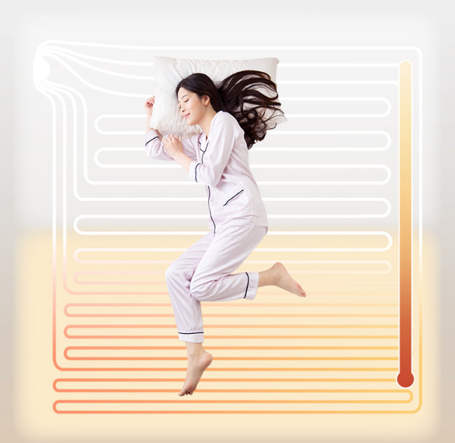 在传热核心上,它采用PTC发热体加热+悬浮式进口BLDC水泵循环的组合。PTC发热体稳定加热水体后,由BLDC水泵驱动温水在床垫内部的PVC管路中循环,通过水体传递热量,而非直接用电流加热空气。这种方式避免了传统电热毯“烘烤式”加热导致的水分流失,实现“温暖不燥热,如躺温泉”的体感,整夜使用也不会口干、上火。