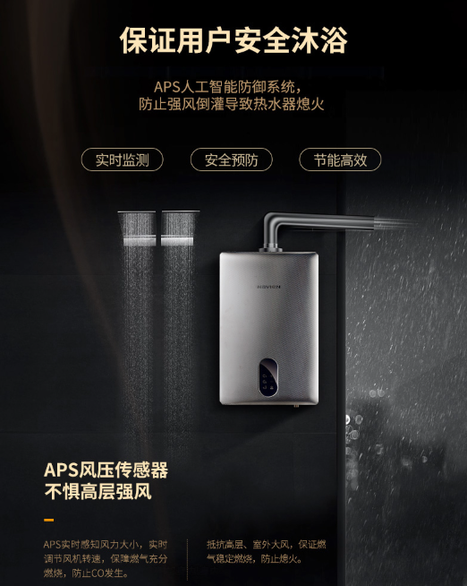 由于海边的环境,外界的季风气候或者是海风,常常造成窗外高风速的环境,比如生活在青岛、威海等这样的滨海旅游城市而言,窗外常常刮风,容易影响燃气热水器的燃烧,有些不具备抗风功能的燃气热水器容易出现燃烧不均匀,燃气倒灌等情况的产生,进而影响燃气热水器的正常燃烧,不但影响正常的沐浴用水的水温加热进度,而且会进一步影响燃气热水器的安全因素,庆东纳碧安选择的应对方案是APS风压传感技术,其主要的优势就能够实时感知外界风力大小,实时调节风机转速,保证燃气充分燃烧,防止CO发生,对于高层、室外大风等环境、保证燃烧温度,防止熄火等。在实际的使用过程中,具备有CO强力抽排作用,当APS感知到燃烧不充分时,风机补正风量,智能调节风机转速,分配合理的供氧量,并将CO强抽出去。总之,对于海边的使用环境当中,庆东纳碧安(比如庆东纳碧安NGW670系列燃气热水器)搭载有专利的APS风压传感技术,能够完美的应对外界风力较大的环境,稳定的燃烧。