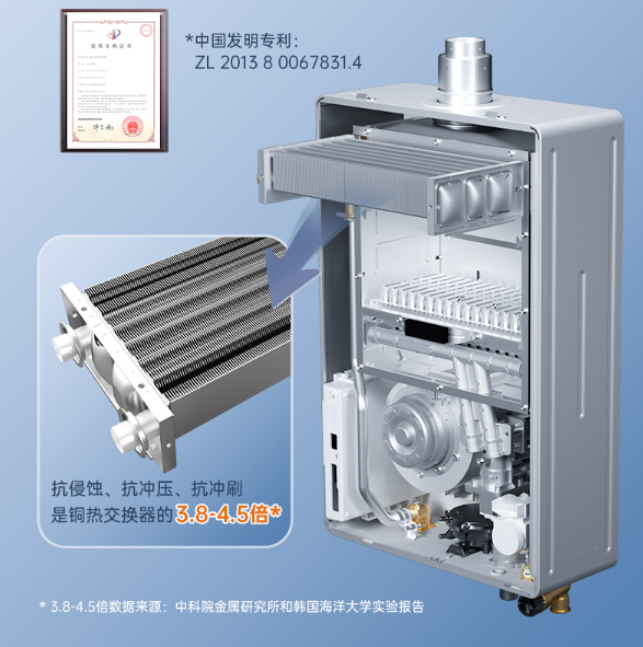 首先,要主动避开的选择是铜热交换器的燃气热水器,这种铜热交换器,在最开始是作为燃气热水器的热交换器的主要类型,但是随着时间的推移,人们发现铜热交换器由于铜本身的化学性质活泼的属性,使其在实际的应用过程中太过于“脆弱”,这多表现为本身铜热交换器在实际的与水频繁接触中,易腐蚀、易遭受冲刷、冲压、表面容易附着水垢等物质,以此容易引发燃气热水器本身的热效率降低,并且容易被腐蚀漏洞,导致燃气热水器的本身热交换器用不了几年可能需要更换的情况,让用户使用起来既恼怒又麻烦。
