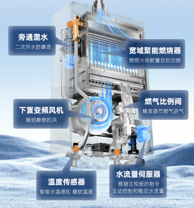 首先,庆东纳碧安的NGW570C系列的燃气热水器搭载有双水量伺服器,首先其由于有主控板的指令,可以根据主控板的指令,利用主水量伺服器主动控制和稳定水流量,其次,其在上方搭载有旁通混水,可以防止二次开水过烫的问题,能够解决水温忽冷忽热的毛病。
