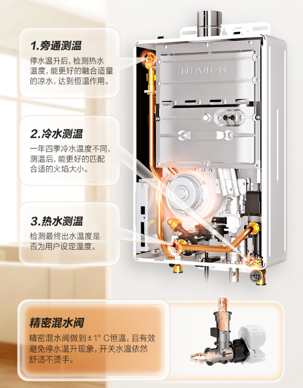 第二,很多人在使用燃气热水器的时候,仍旧害怕的是燃气热水器的恒温功能,根据科学研究,人体的体感变化温度是1℃,在1℃范围内,人体是感受不到温度的变化的,而庆东纳碧安的NGW580C零冷水热水器以及庆东纳碧安的多数燃气热水器系列都能将燃气热水器的出水温度控制在1℃,这得益于庆东纳碧安的NGW580C系列采用的是智能三段式燃烧技术,1/7微火焰燃烧,并且是全网首款三点测温的燃气热水器,可以在冷水测温、热水测温、旁通测温三个方面进行测温,并且配合有水量伺服器与旁通混水,可以在30-60℃的广域调温里,精准至℃精准控温。